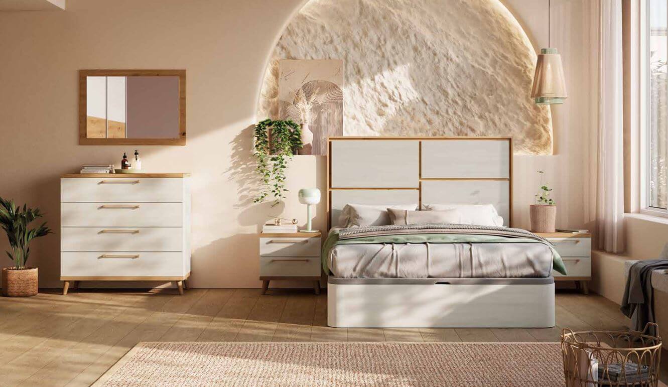 Compuesto por: cabezal, canapé con arcón 150×190, 2 mesitas de noche con patas, cómoda con patas y espejo
