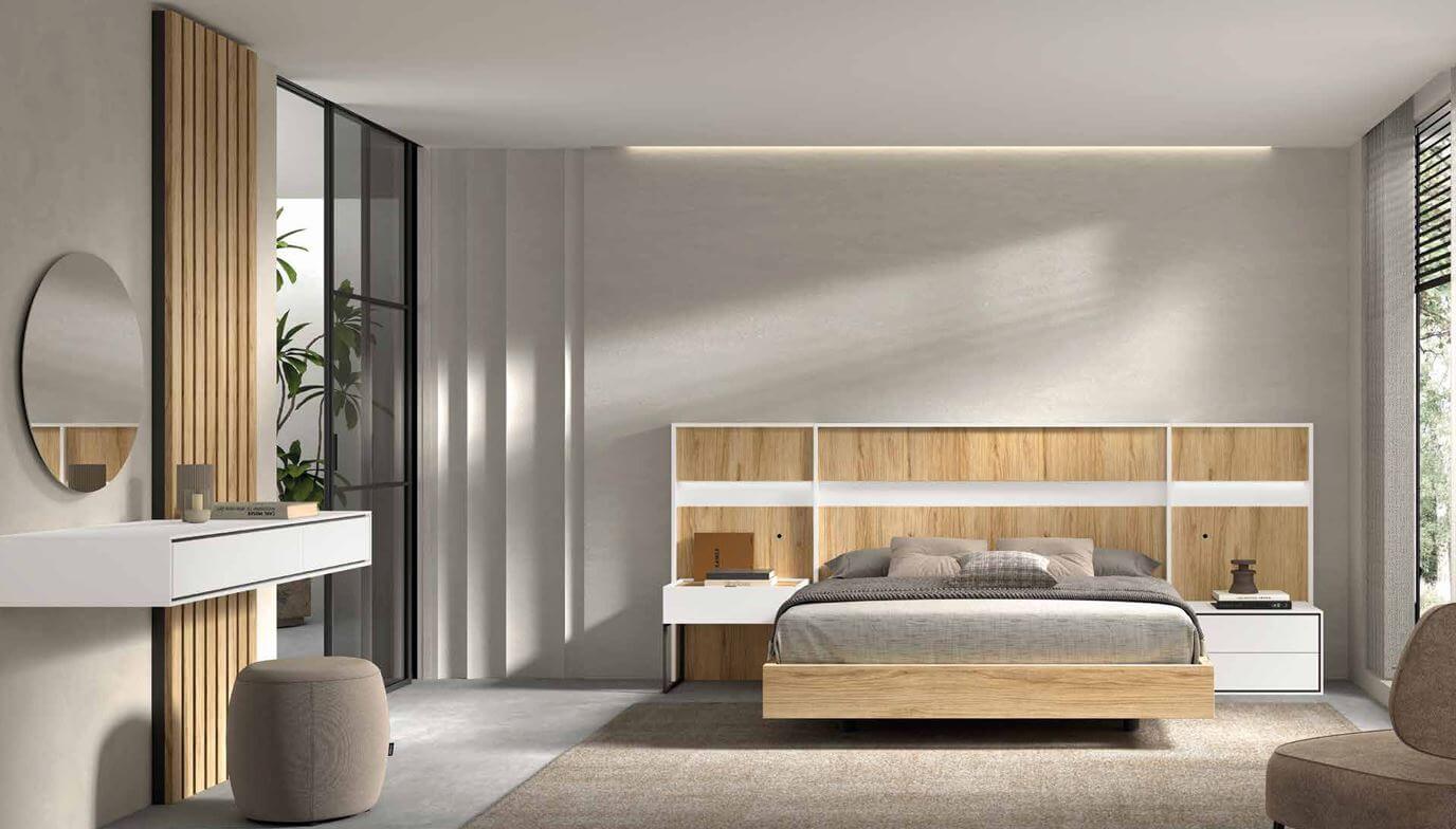 Compuesto por: cabezal, aro bañera 150×190, 1 mesita de noche con patas, 1 mesita de noche 2 cajones, comoda colgada, panel alistonado y espejo