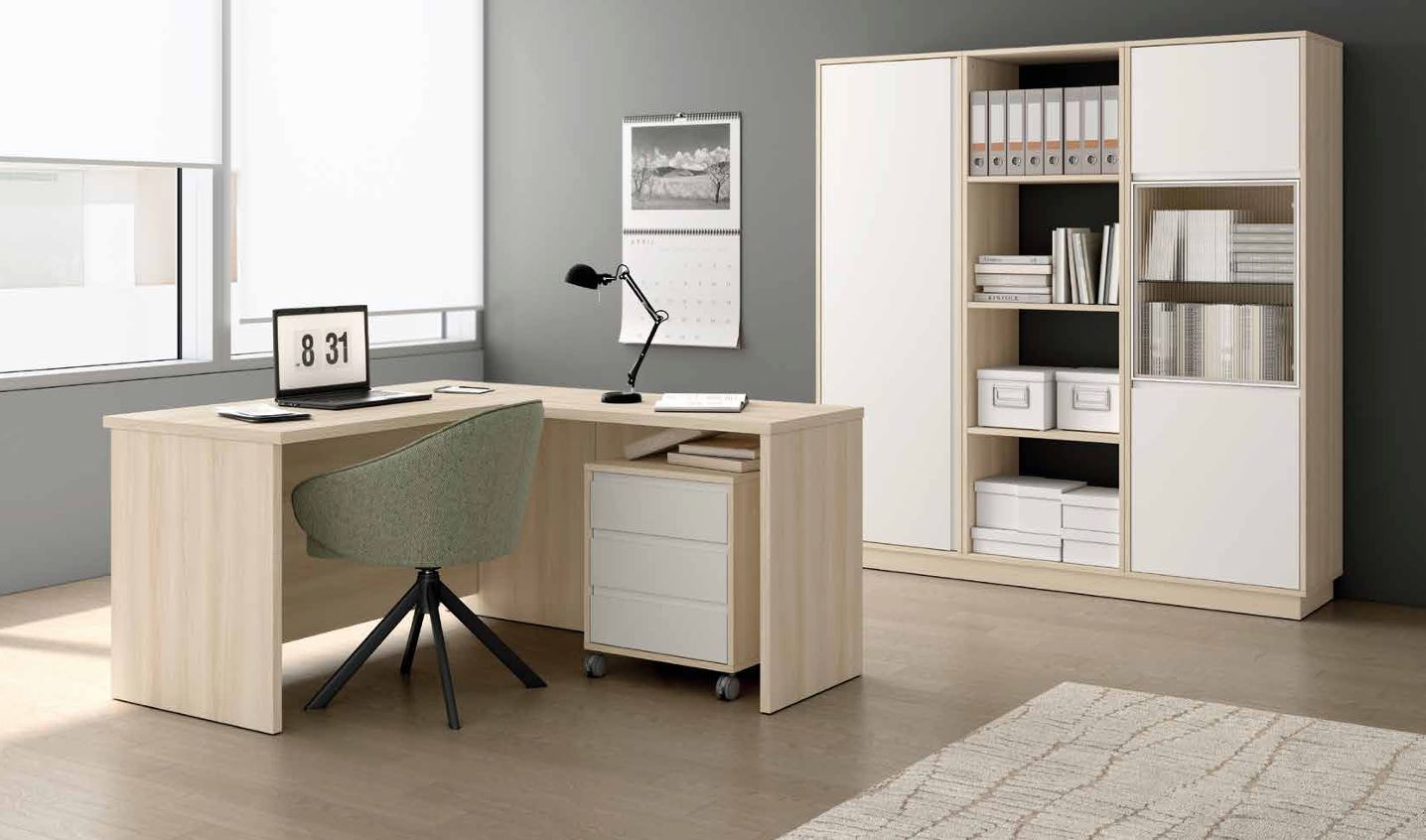 Mobiliario de oficina color olmo y blanco, compuesto por: