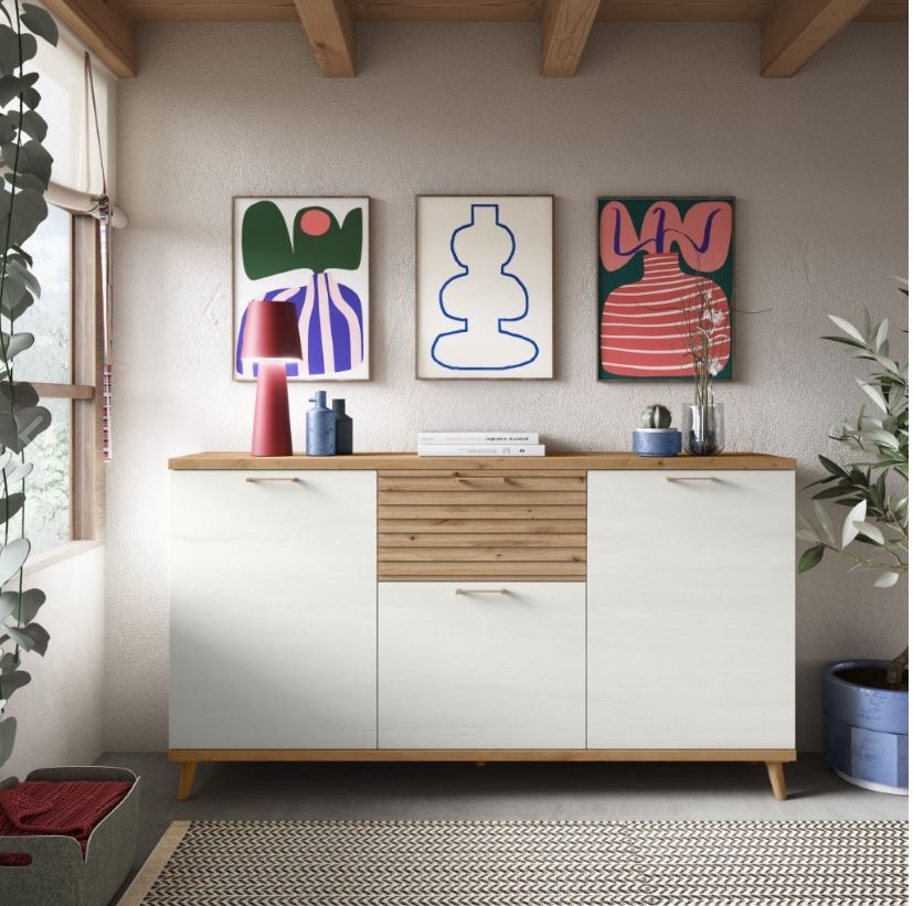 Aparador 3 puertas + 1 cajon contenedor moldurado lineal con patas redondas color artisan y polar