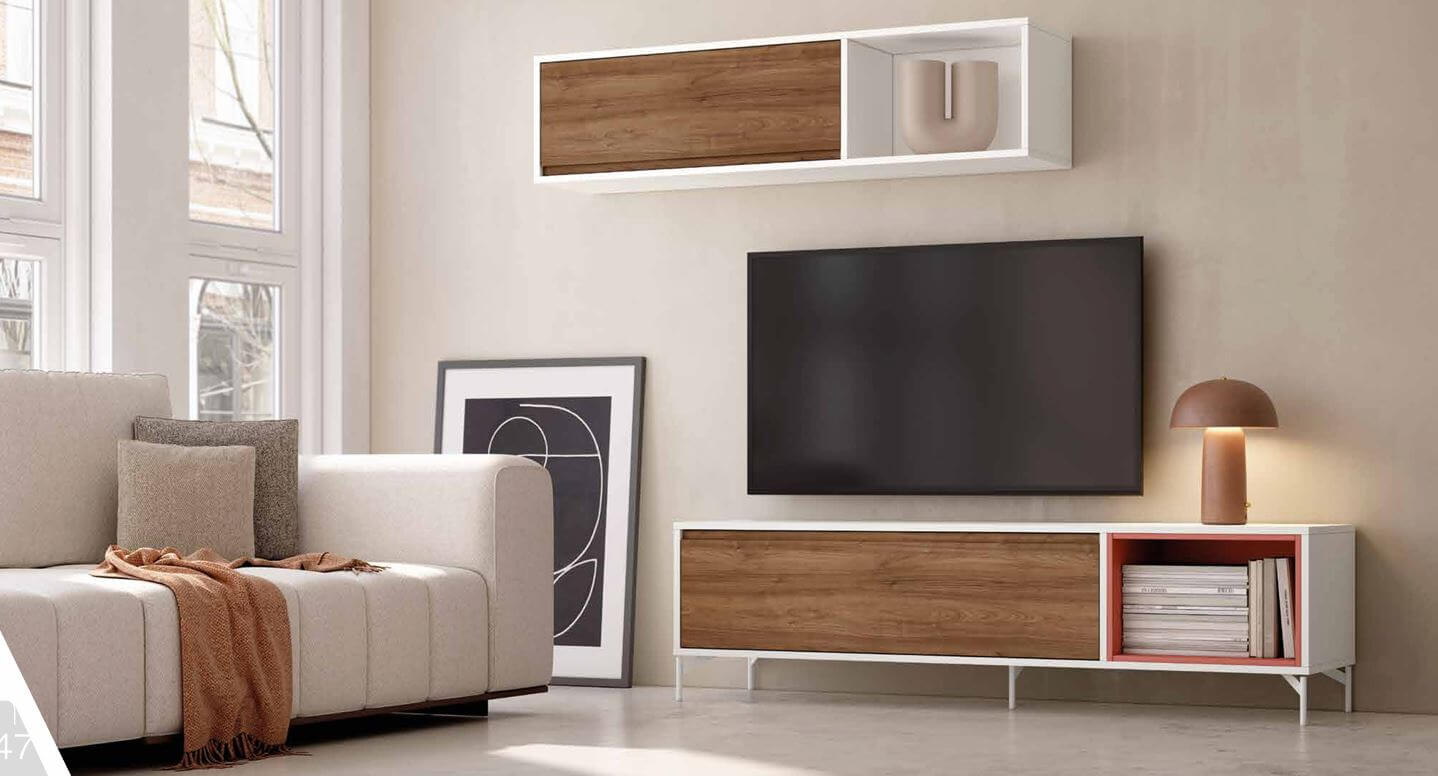 Mueble de salón color blanco, java y terracota
