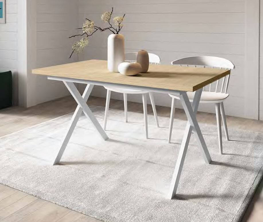 Mesa de comedor 140×90cm extensible a 191cm. Patas metálicas X color blancas y tablero color nuez